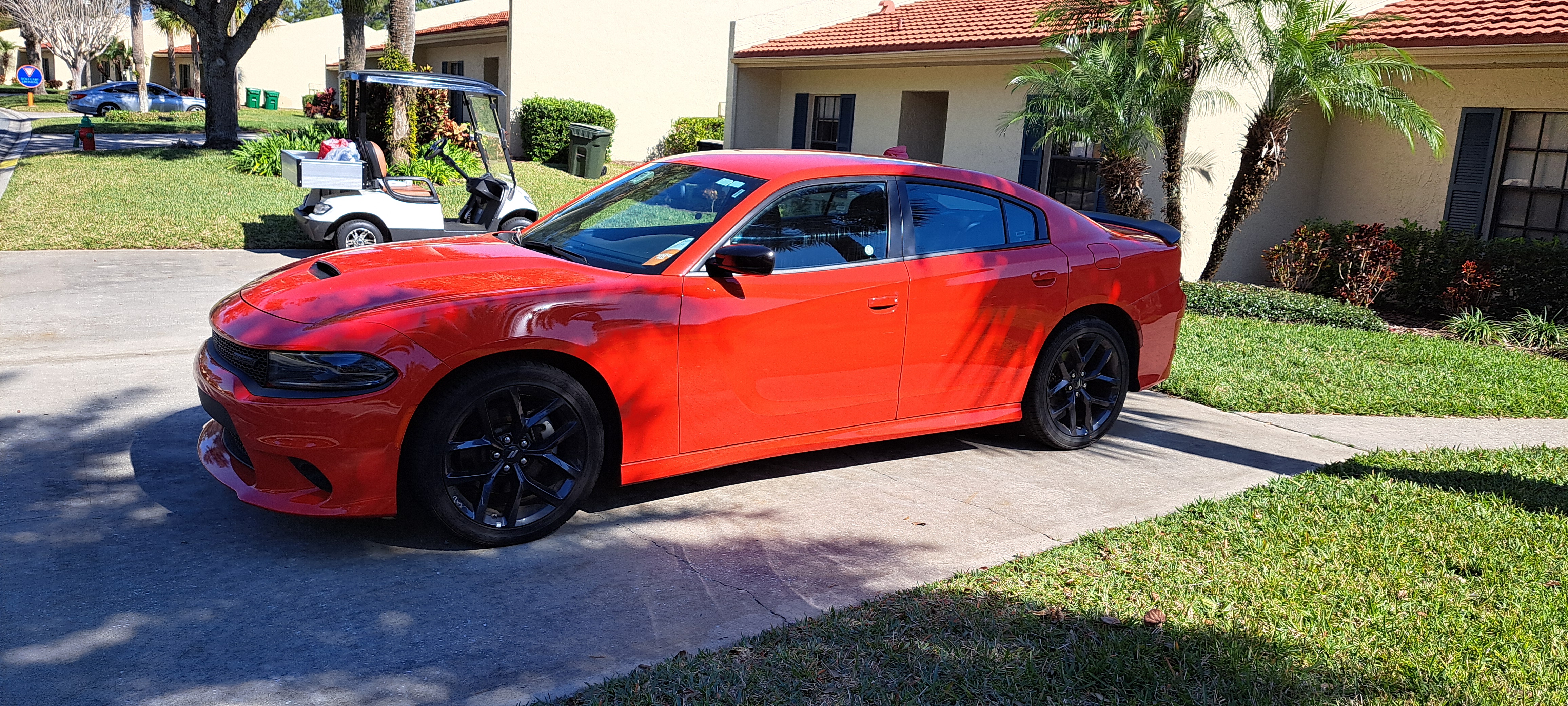 Our hotrod rented in Texas, parked in front of our Holiday Inn Orange Lake, standalone duplexunit 208 very nice and convenient!