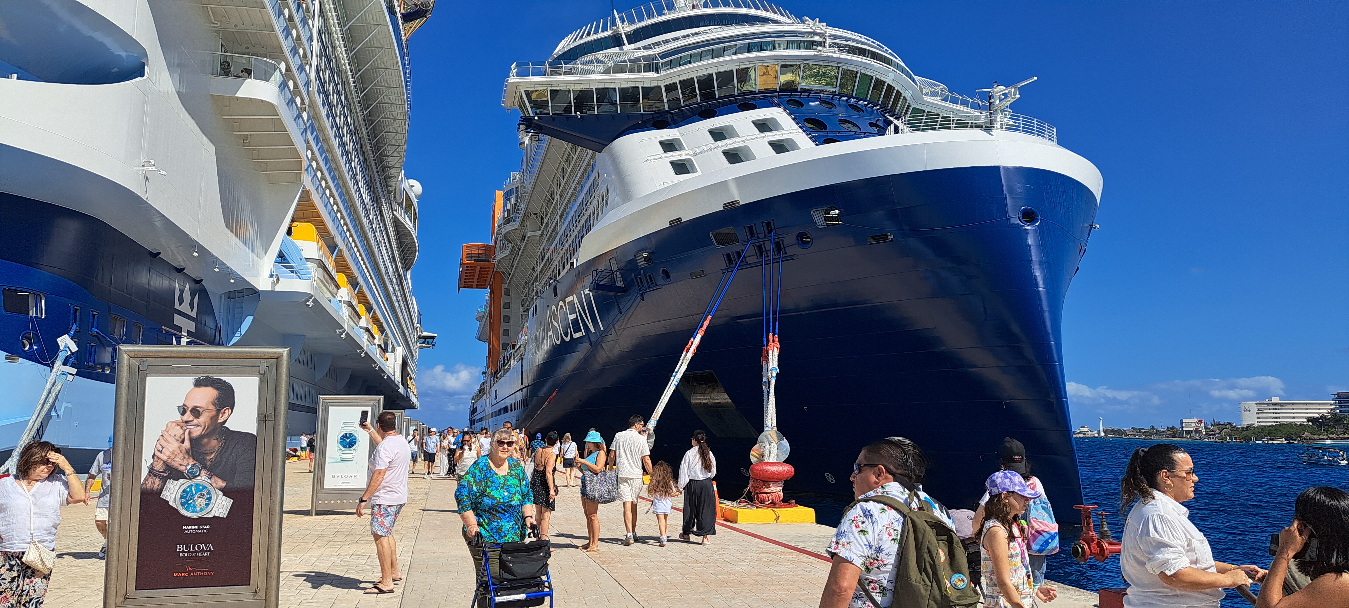 Cosumel, Mexico Katie headed down the dock toward town. Our Celebrity Ascent on the right 2/7/24