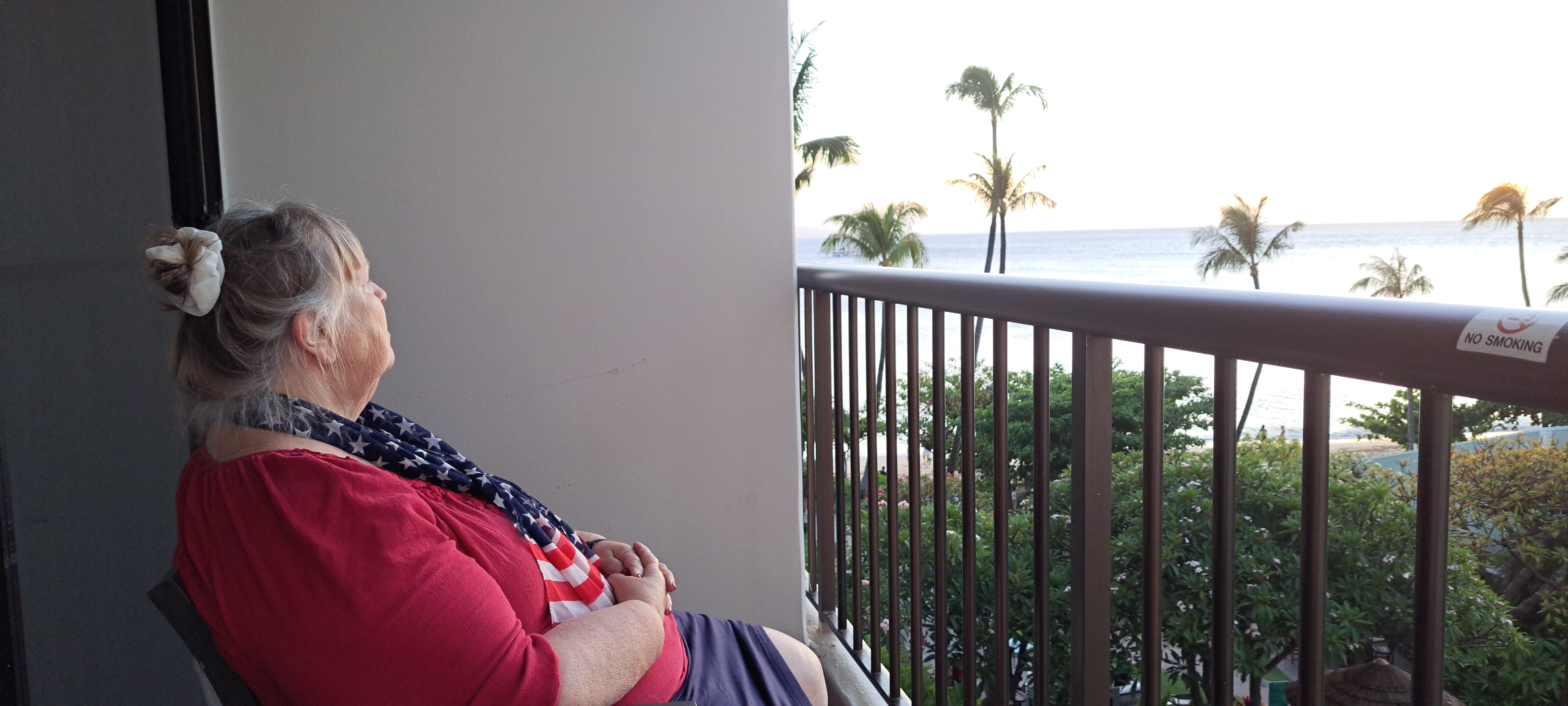 Katie on our Maui balcony dressed up for July 4th! 7-4-24