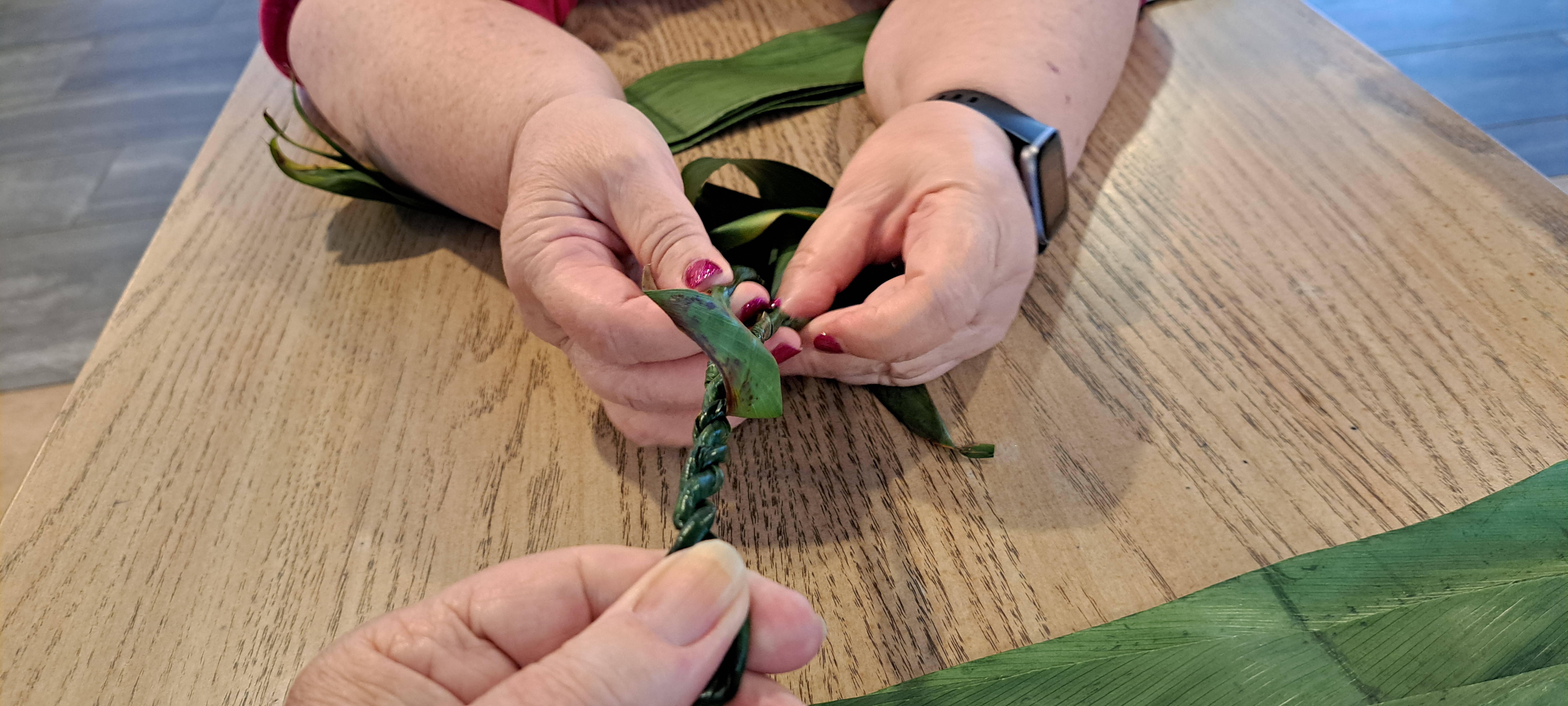 Ti leaf lei making class taught by Kaluna (night auditor at resort) at the Sheraton Coconut Beach Resort, Kauai 7-6-24