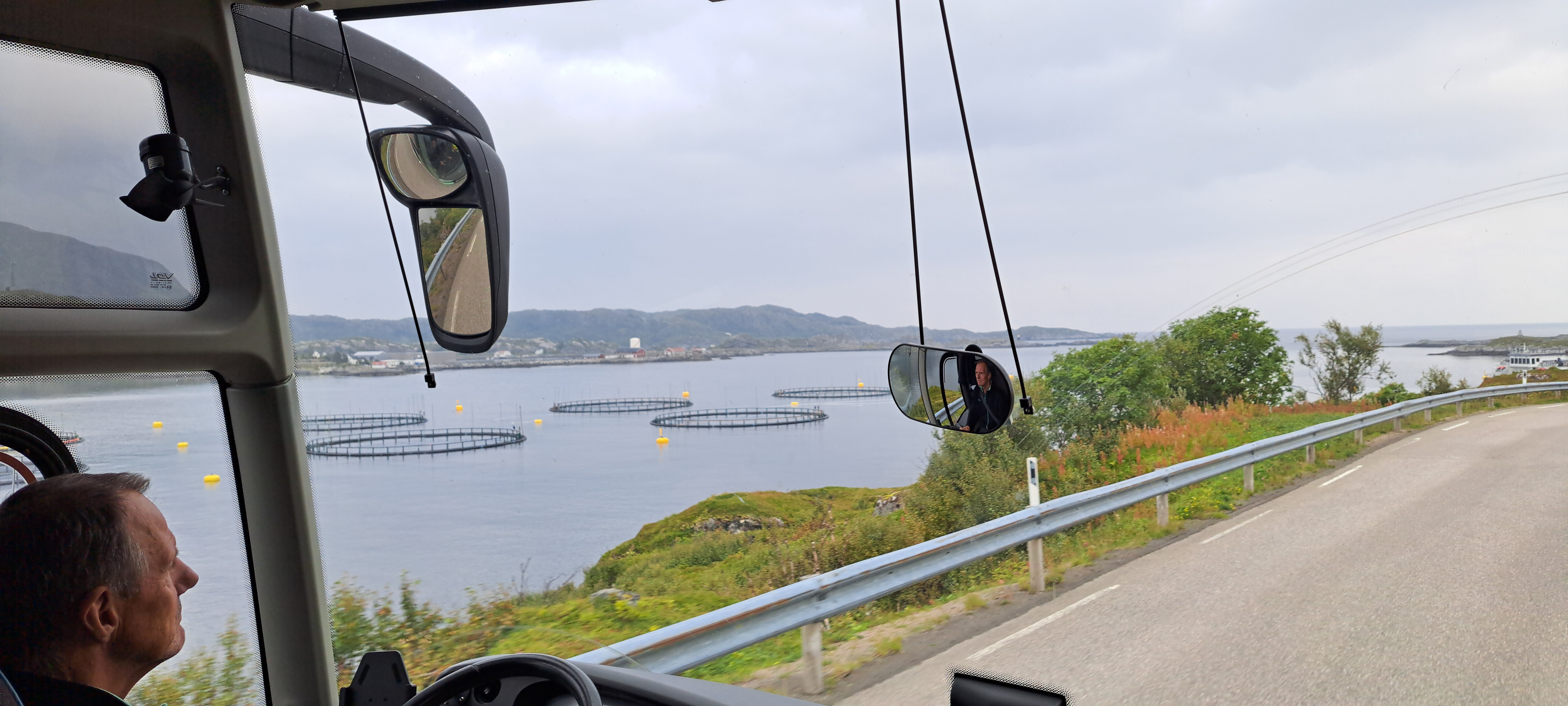 Our last Norway stop. Leknes at the Lofoten Islands, note the fish farms off to the left of the bus (circles) 8/31/24