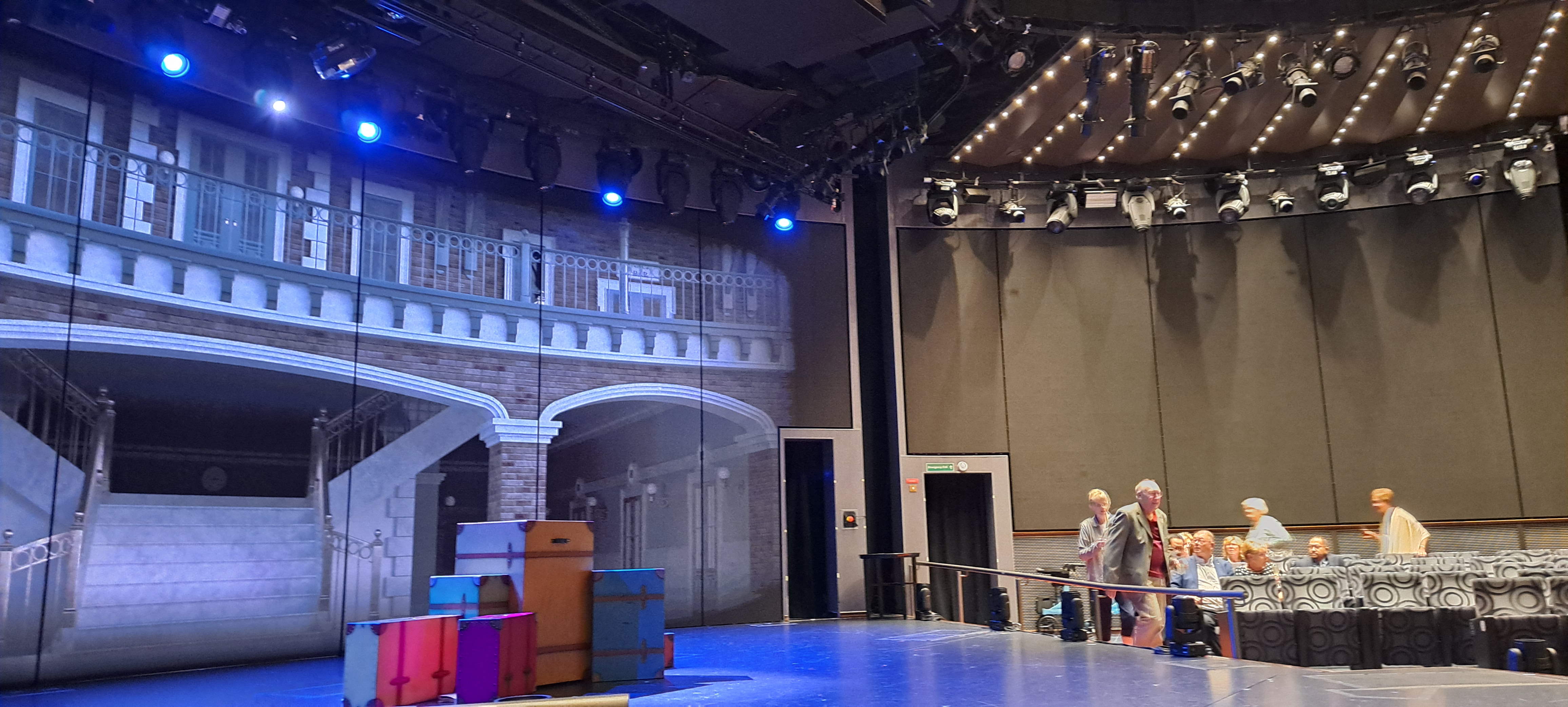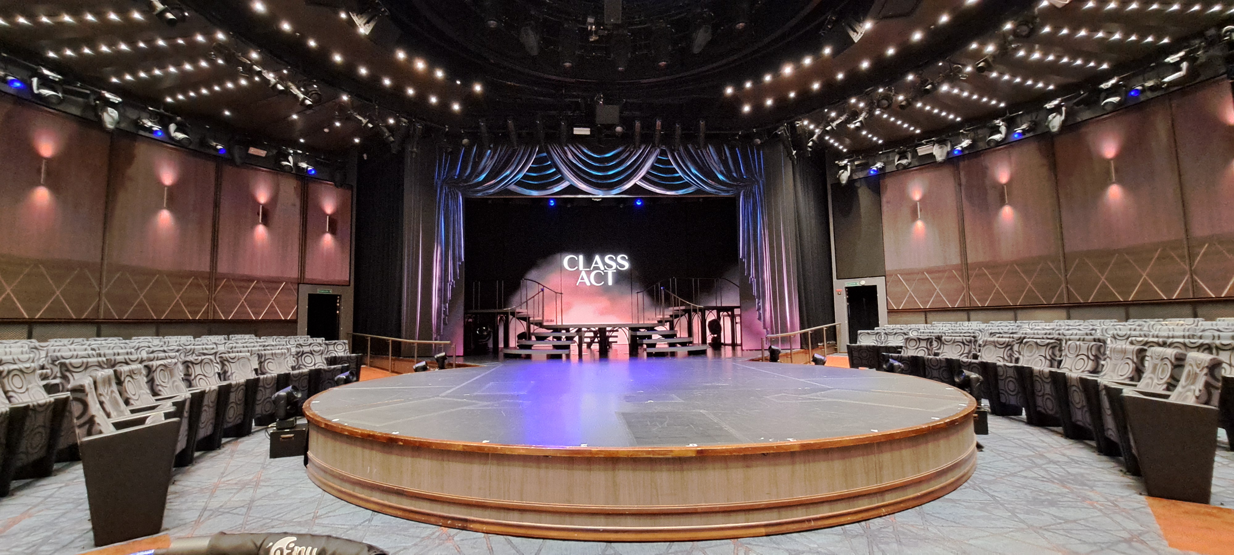 Another view of the ship's theatre, note there are no lights on the walls everything from the seats up to the white