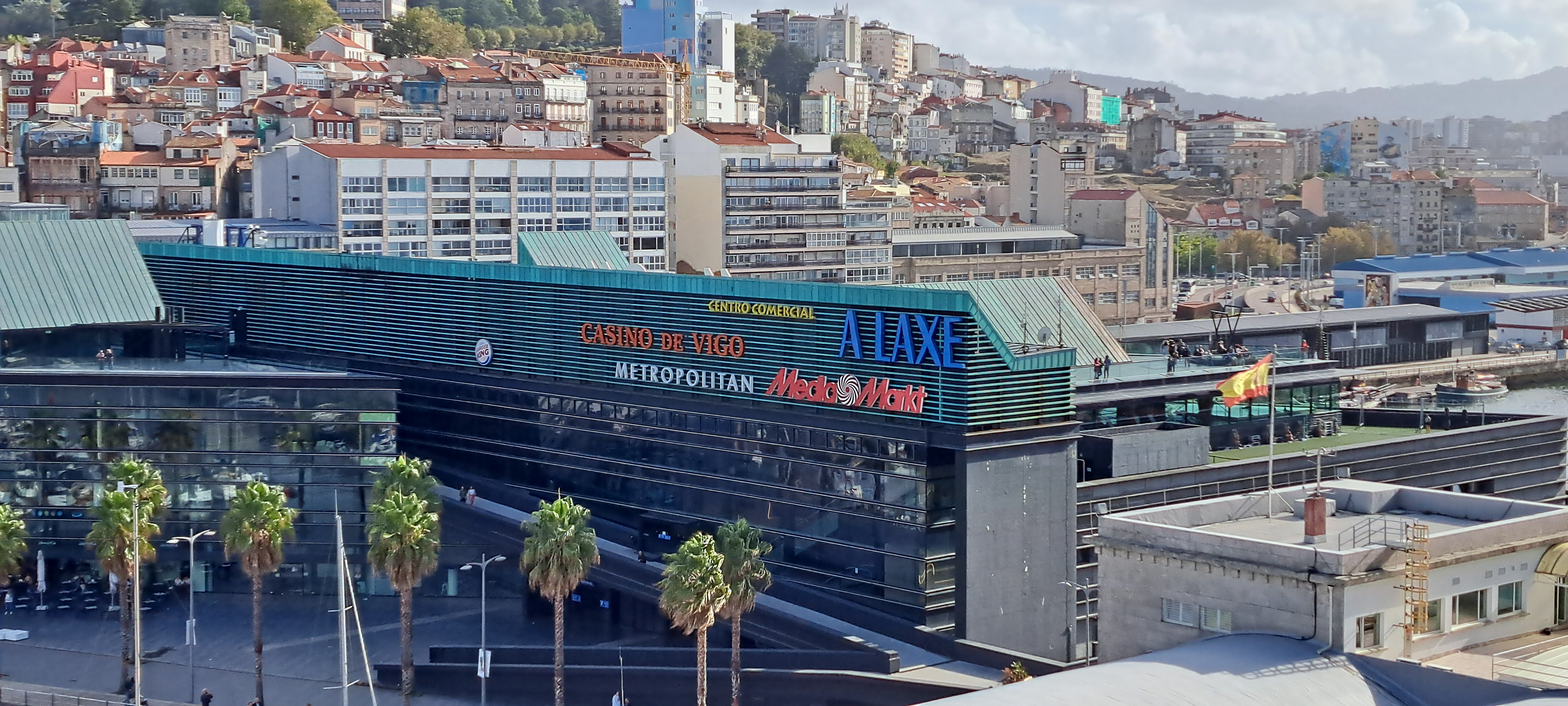 Vigo, Spain, view from our cabin. Went into this shopping center to find something, Media Mart is like a
