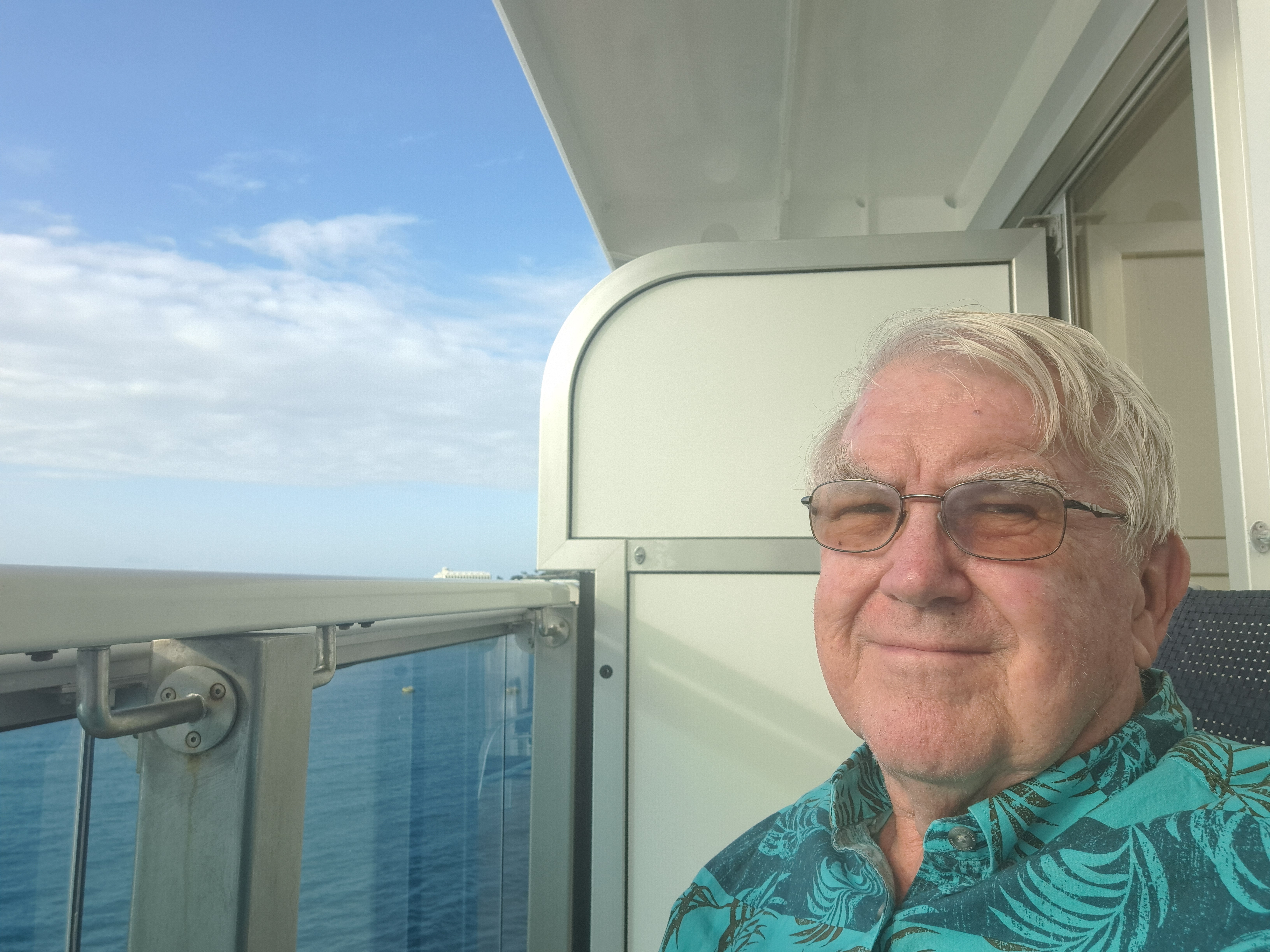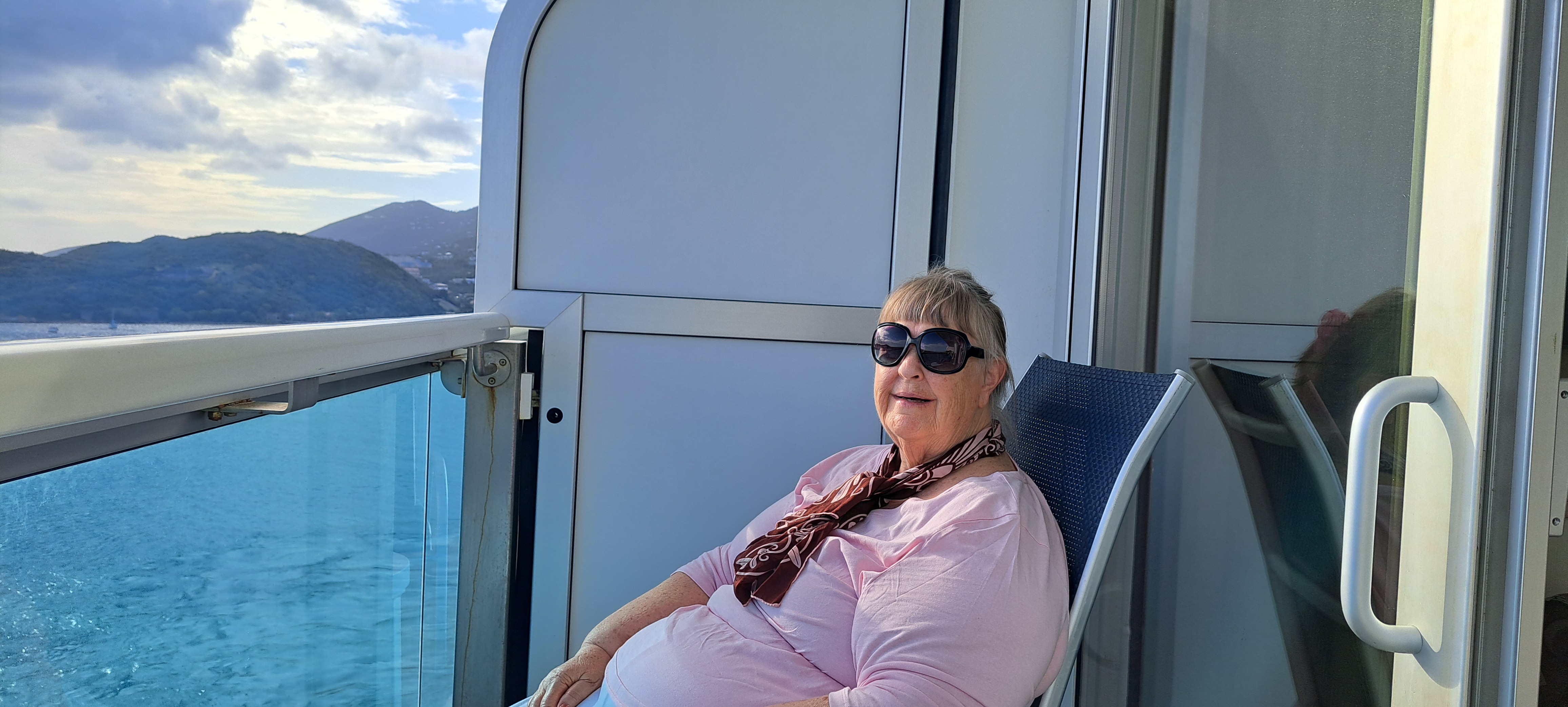 Katie relaxing on the balcony as we cruise out of St. Thomas 3-23-25