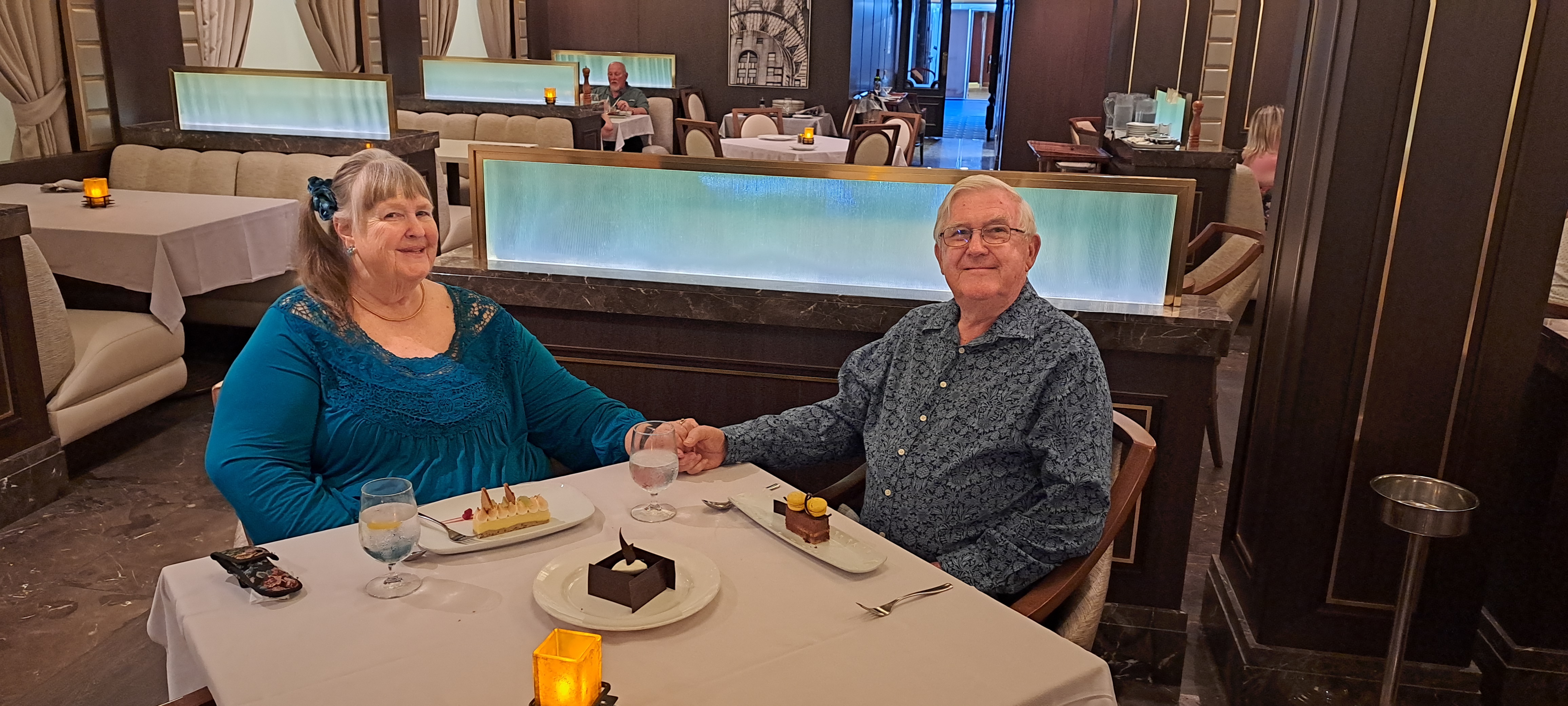 Our special 30th Anniversary dinner at the ship's steak house. Special free desert in the middle of the table 3-25-25