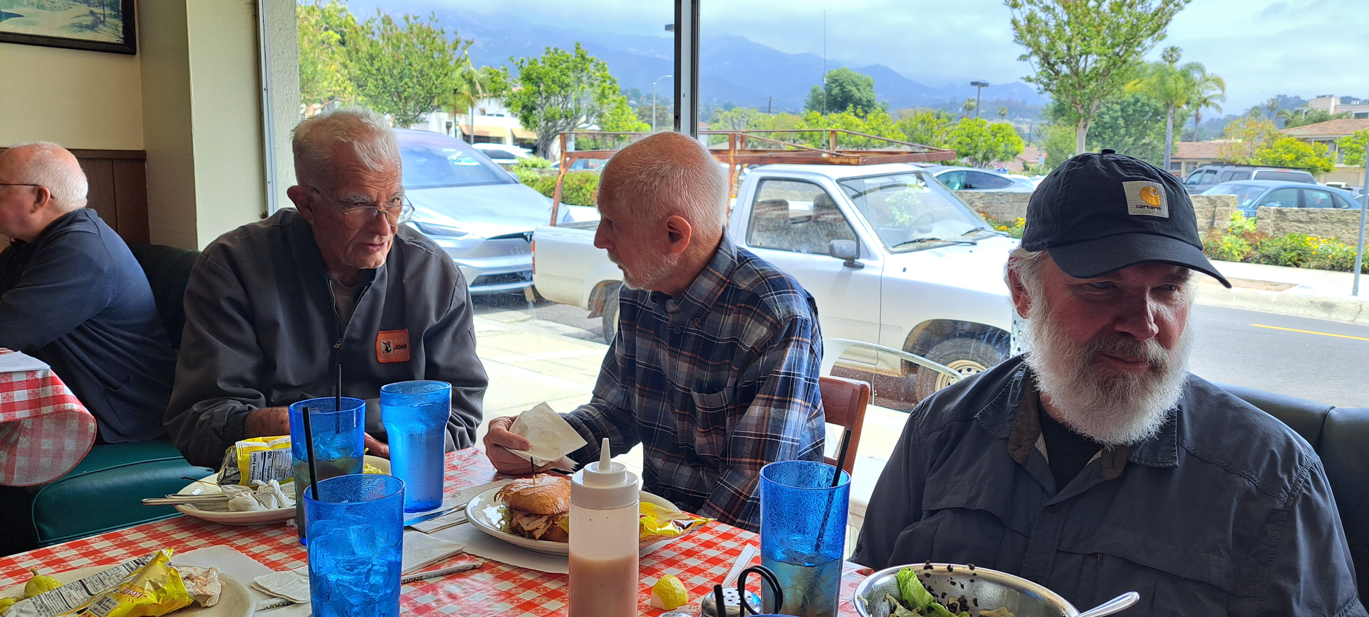 Ham lunch at Santa Barbara Petrini's. John Franklin, K6LUA, Joe Sayovitz, W6HCY and John Kendall AB6JK with hat 5-16-25