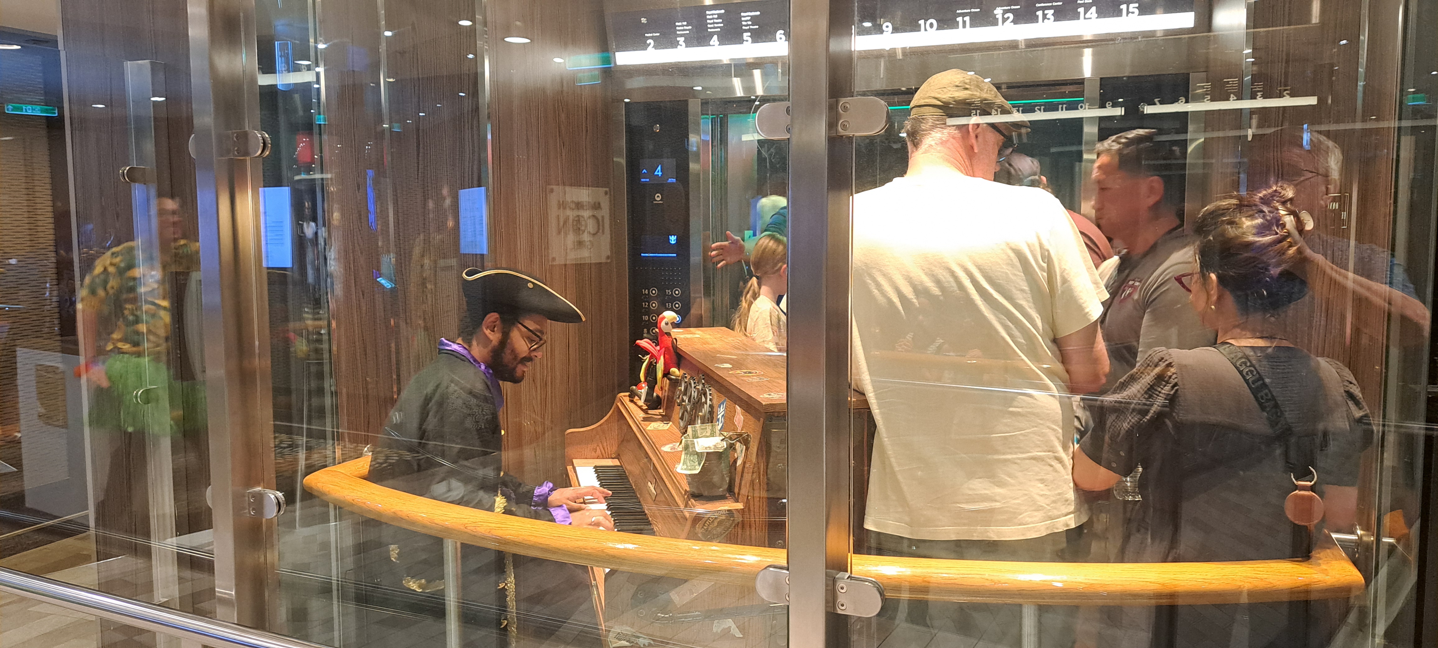 Ovation of the Seas, looks of surprise when people entered this elevator to a piano playing pirate, sorry for all the reflection 7-12-25