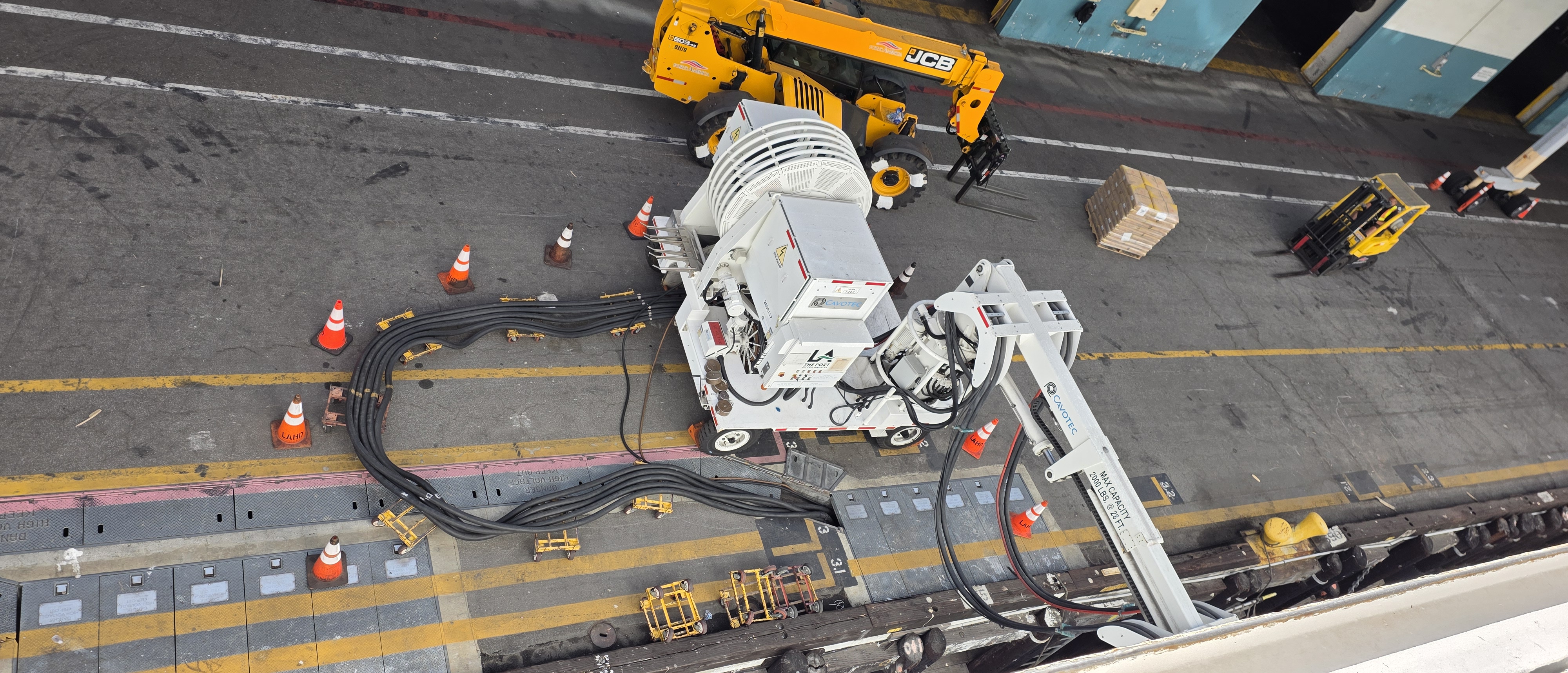 Answer: ships have to use shore power when docked in LA these days, this is connection to underground cables (black ones on left) to ship (white arm)
